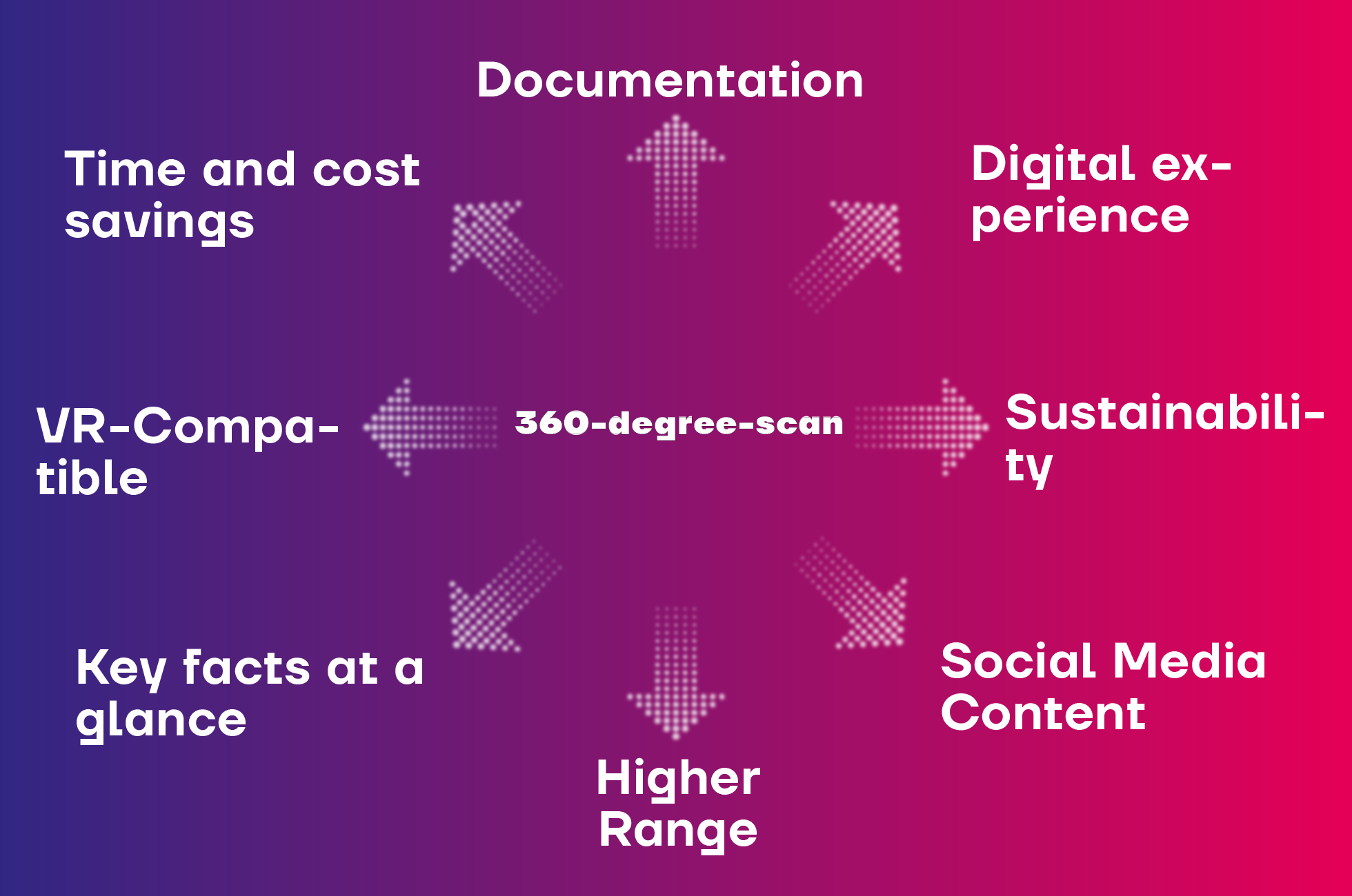 Reduce the effort for your booth by taking advantage of the 360-degree scan! In addition to high-resolution recordings of your booth, we also offer additional content such as teaser videos and GIFs for your social media channels. Our cameras provide impressive scans with an accuracy of +/- 1%, delivering both speed and precision. Thanks to the integration of markers into the 3D environment, you can present important information and key facts at a glance.