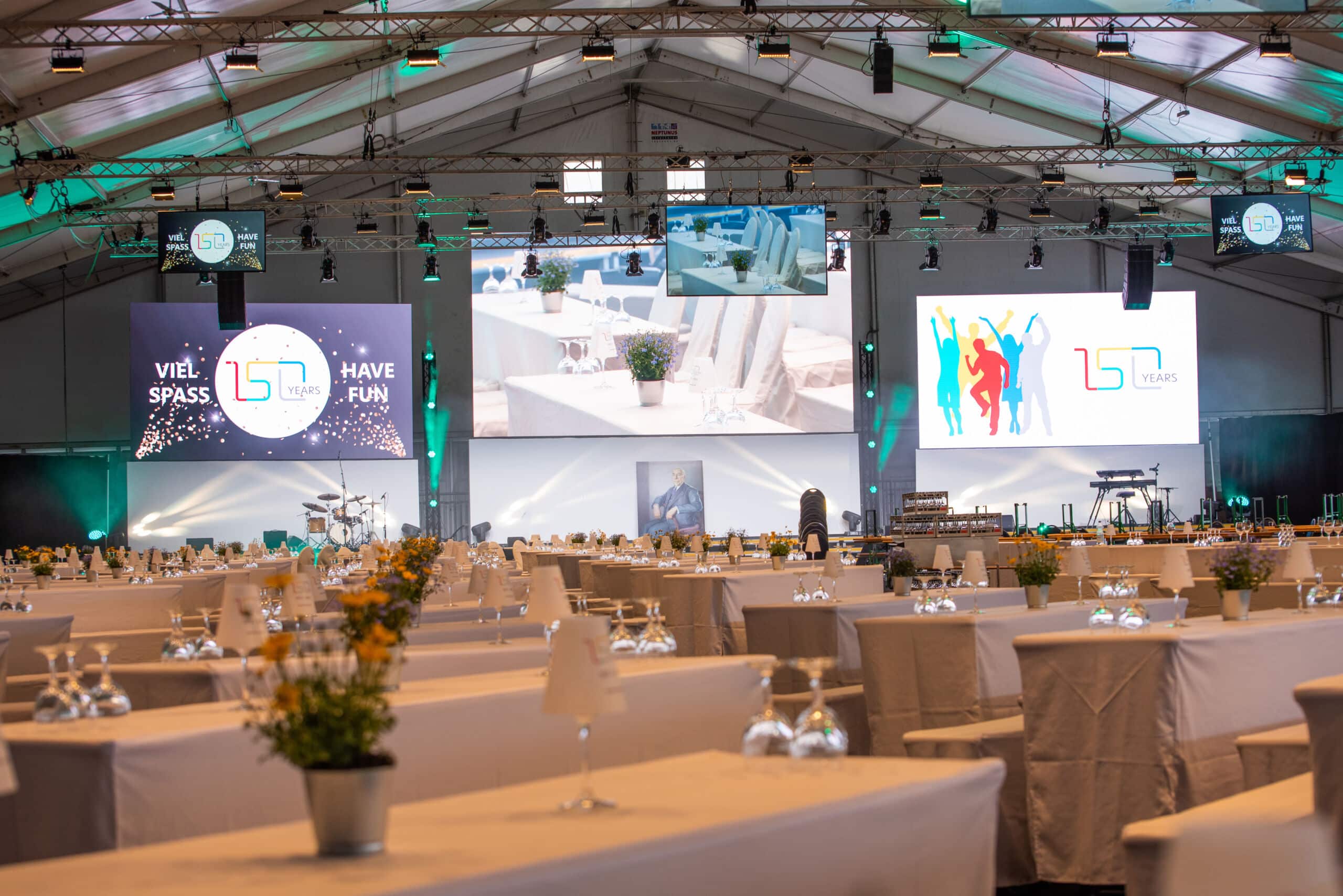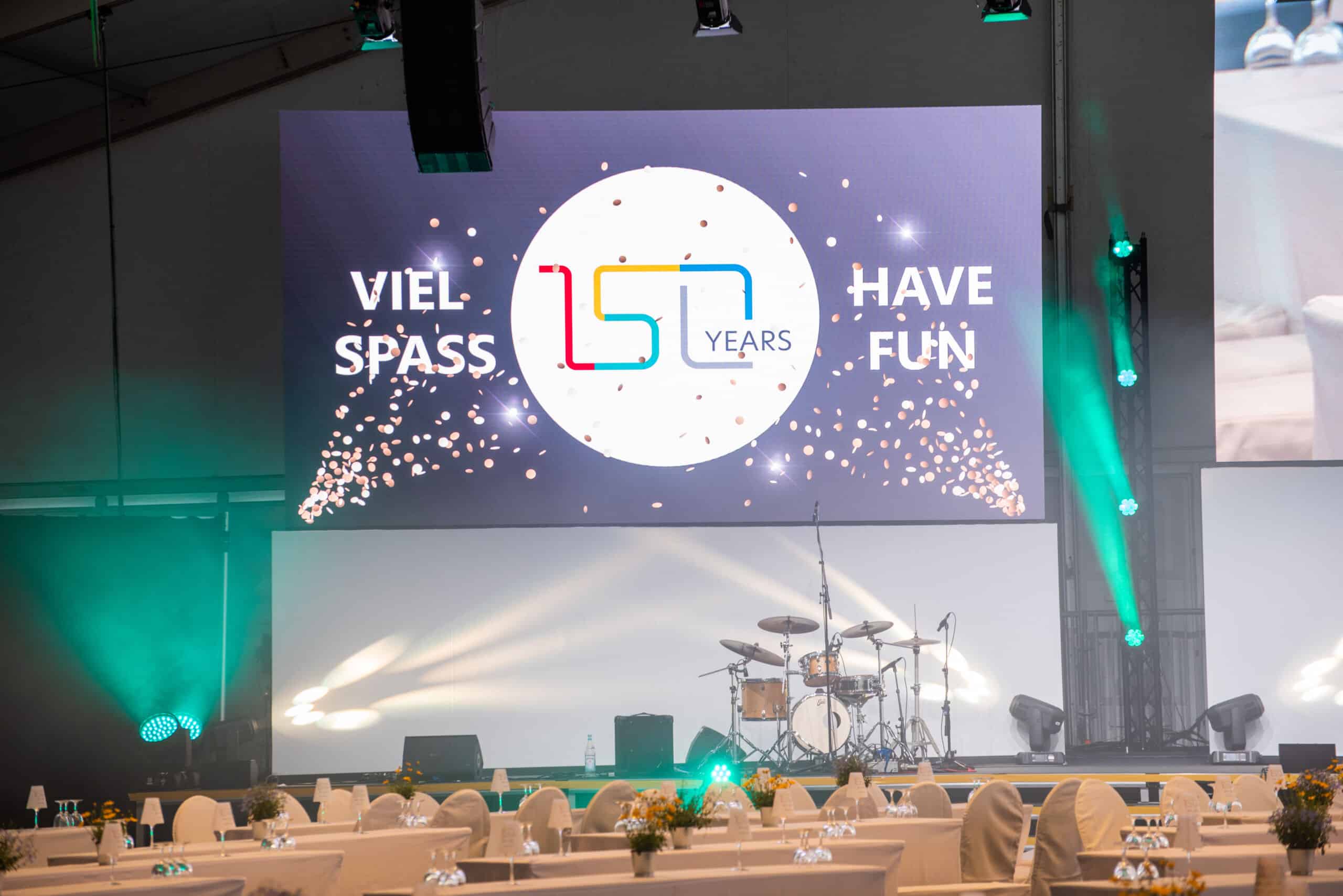Das Besondere an diesem Event war, dass das Jubiläum weltweit an 16 weiteren Standorten zur gleichen Zeit gefeiert und per Live-Stream in die Zentrale nach Mönchengladbach zugeschaltet wurde. Das bedeutet, dass die gesamte Belegschaft von Scheidt & Bachmann an diesem Tag miteinander verbunden war, und gemeinsam ihr 150-Jähriges Bestehen zelebrieren konnte. Neben den Zuschaltungen, stellte vor allem die Simultan-Übersetzung eine Herausforderung dar. Mit mehreren Dolmetschern wurde das Event gleichzeitig in 3 verschiedene Sprachen übersetzt inkl. Live-Transkription, d. h. mit Untertiteln in der Originalsprache. Als Full-Service Dienstleister lieferten wir das ganze Spektrum an Technik – von LED Wänden mit passenden Rückwänden, über das Bühnen-Setup, bis zur Beleuchtung und Beschallung. Live-Bands, Vorträge und echte Interaktion … das Event war ein voller Erfolg!